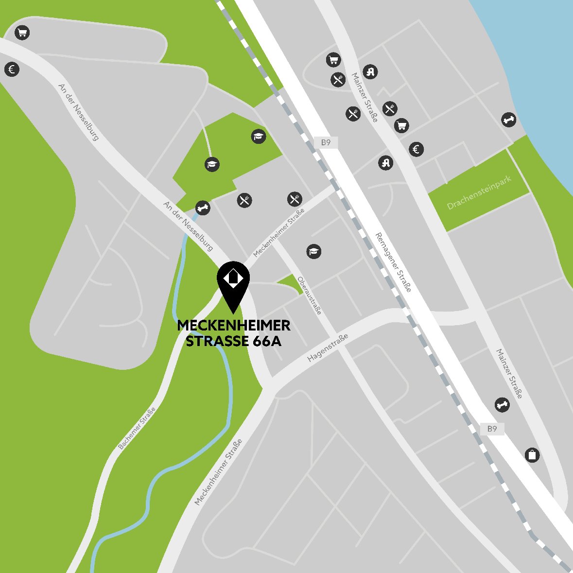 In Mehlem lässt sich ruhiges Wohnen mit direkter Erreichbarkeit der regionalen Zentren ideal verknüpfen. Das wunderbare Rheinufer ist nur wenige Minuten von dem Neubau entfernt.
