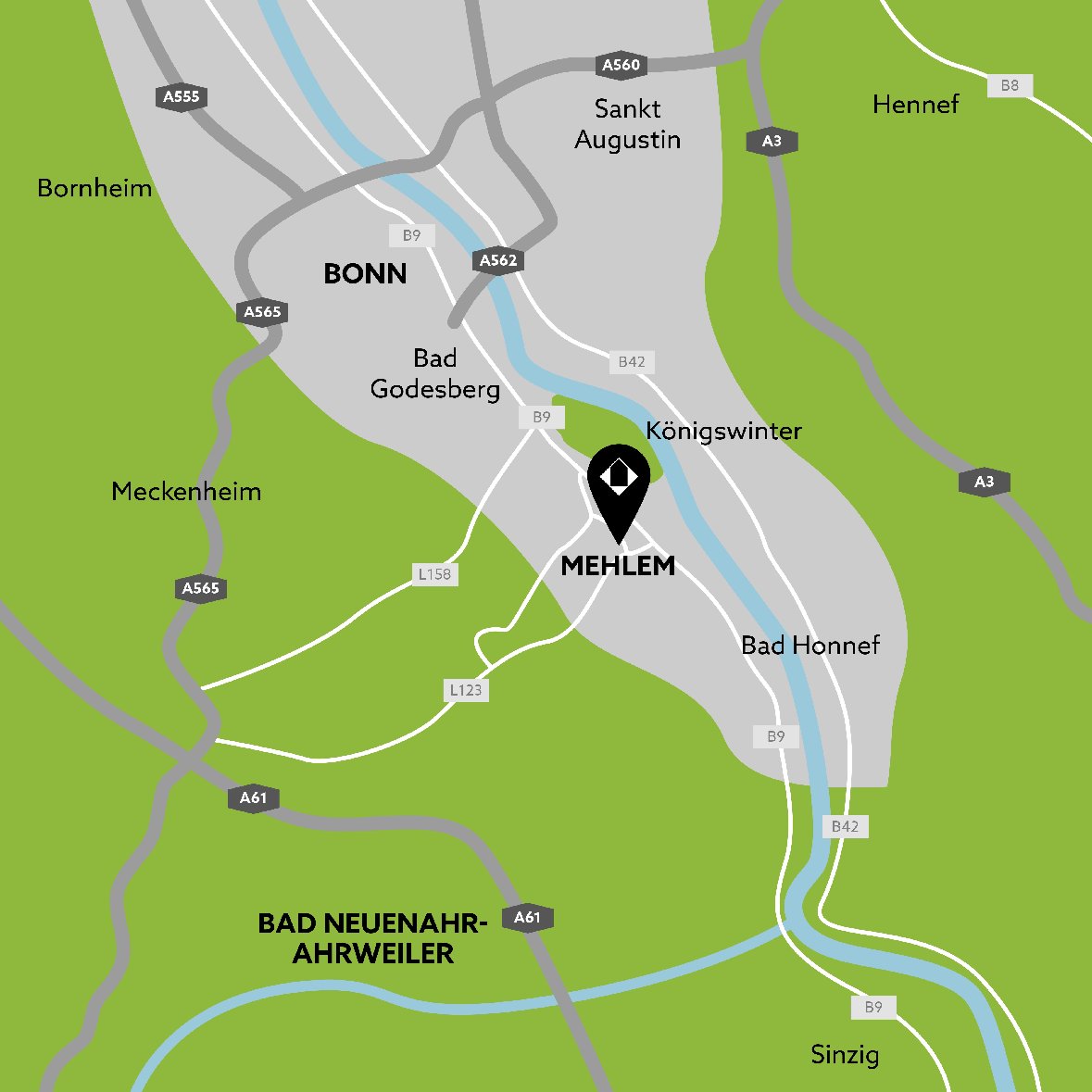 Der Neubau befindet sich im Bonner Stadtteil Mehlem, dieser liegt linksrheinisch im Süden des Stadtgebiets.
